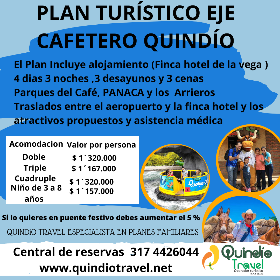 Plan turistico para disfrutar del Quindio Y eje cafetero en vacsaciones en y familia conoceras su exuberantes cultura , tierra , parques temáticos y su don de gente , el plan incluye Alojamiento en finca hotel las Vegas 4 dias trers noches , incluyendo desayuno y cenas por noche , el traslado desde el terminal terrestre o aeropuerto el eden hasta la finca hotel y los atractivos propuesto , seguro viajero y el acompañamiento de todo el equipo de Quindio travel. VEN AL QUINDIO Y EXPERIMENTARAS LA MAGIA DEL ENCANTO